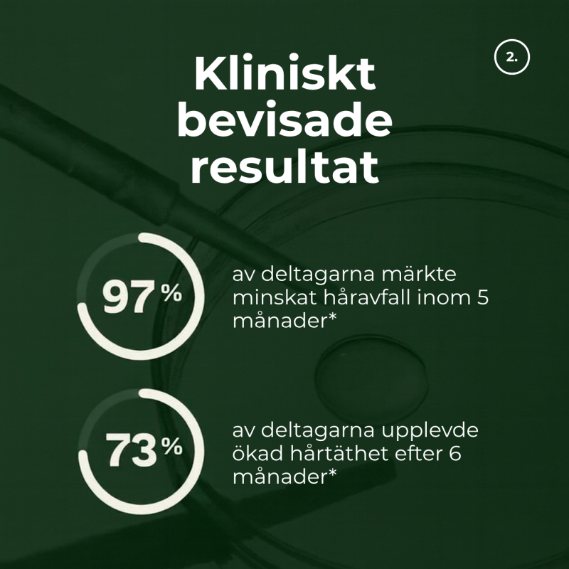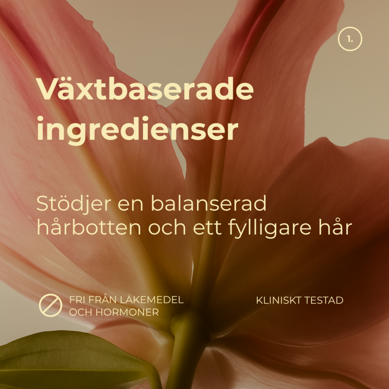 - Växtbaserat Baicapil®-komplex – ökar cellaktiviteten i hårsäckarna, minskar håravfall och stimulerar ny hårväxt.