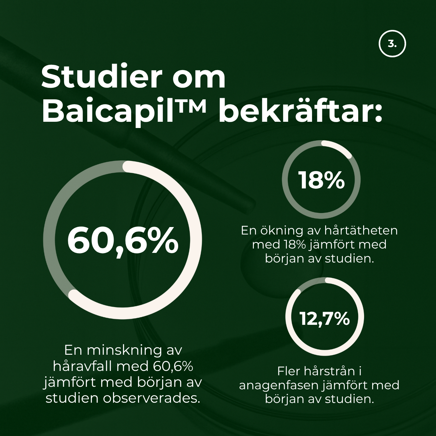 Resultaten kan variera beroende på individuella förutsättningar. I kliniska studier med Baicapil® minskade håravfallet med upp till 60 % efter 90 dagar, och hårtätheten ökade med upp till 18 % efter 180 dagar.