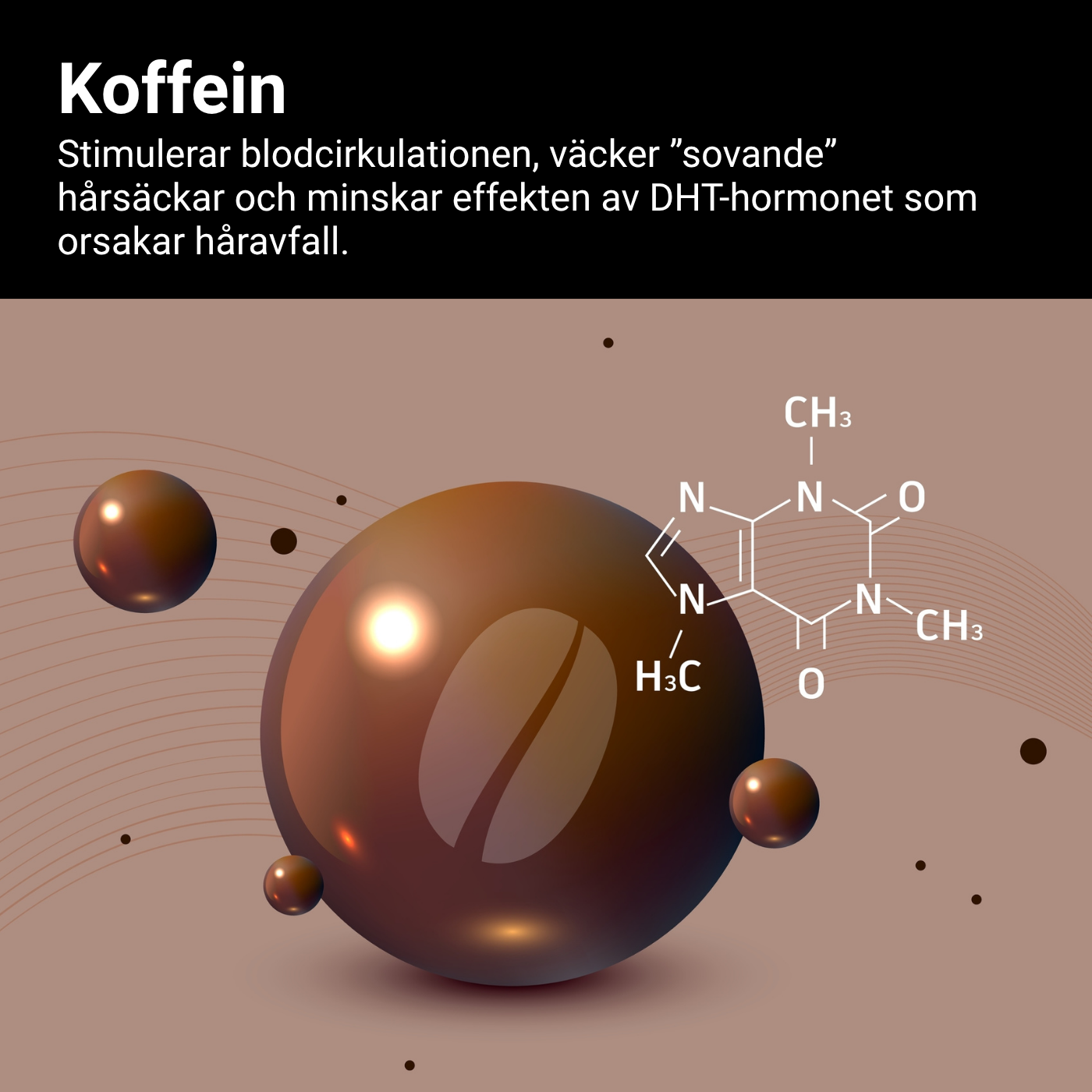 | Koffein – stimulerar blodflödet, väcker ”vilande” hårsäckar och hjälper till att motverka DHT (hormonet som är kopplat till håravfall). | ![]() | |